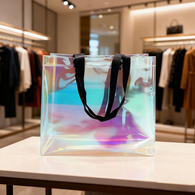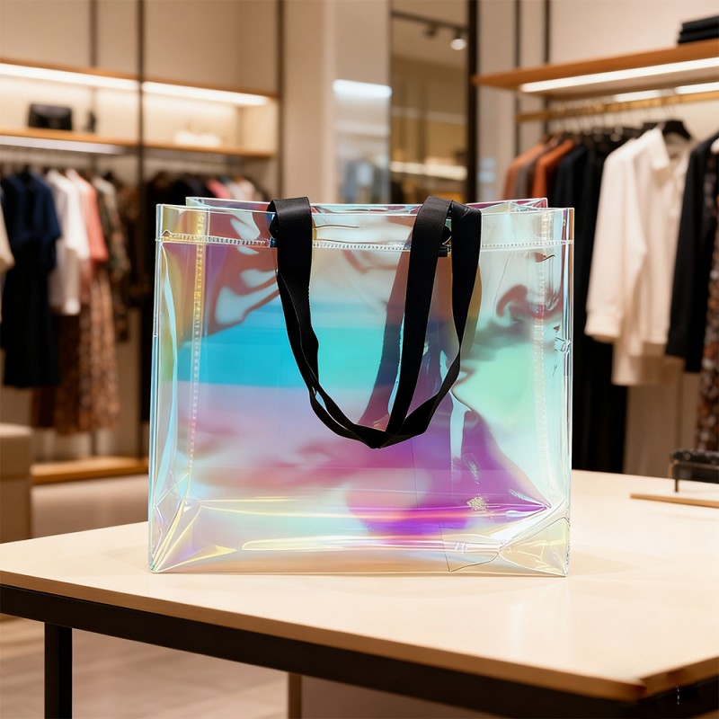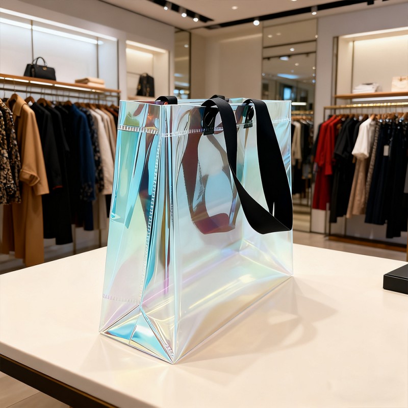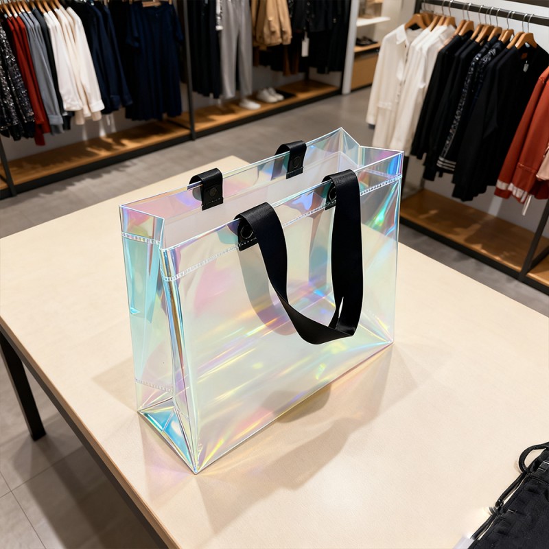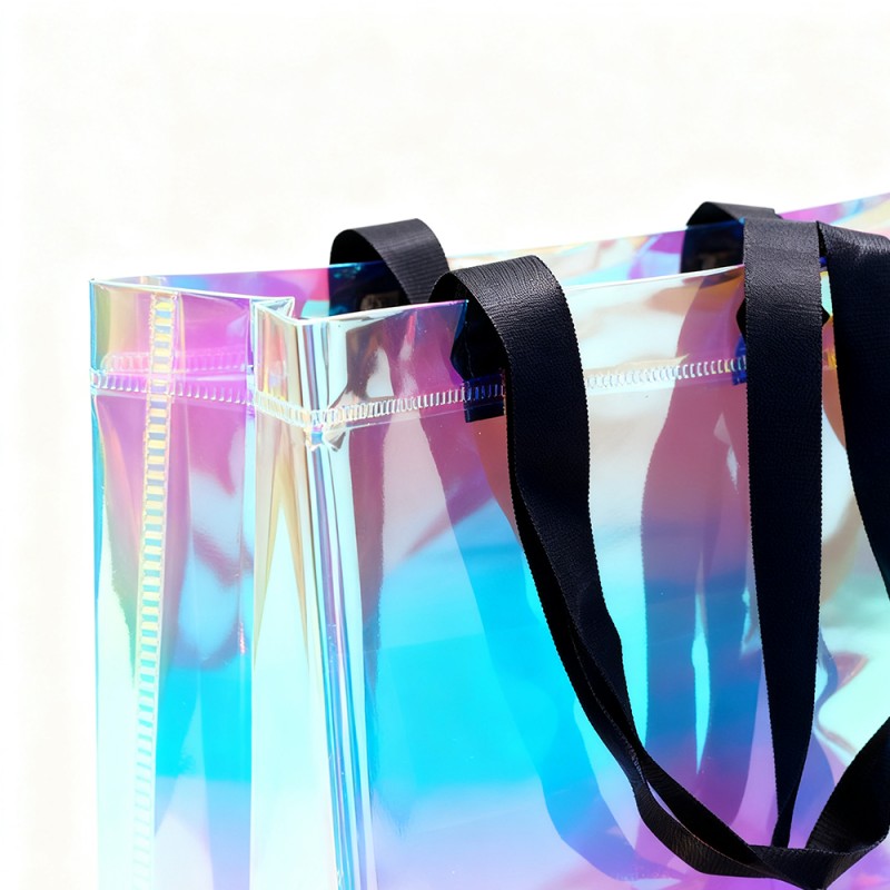 Atractivo visual dinámico: la película especial de este bolso crea impresionantes transiciones de color que cambian con la perspectiva. Este arcoíris tiene un hermoso brillo similar al de las pompas de jabón, creando una obra de arte viviente. Esta forma de tratamiento dentro del material no se desvanecerá con un uso prolongado. Estructura duradera: la película Rainbow no solo tiene una superficie hermosa, sino que también brinda una excelente protección. La superficie tiene resistencia a los arañazos, al desgaste y a la humedad, y puede mantener su eficacia incluso después de un uso prolongado. Este bolso está fabricado con materiales de alta calidad y tecnología de unión ultrasónica, combinando atractivo visual con durabilidad. Excelente personalización: los clientes pueden exhibir perfectamente su marca, marca comercial, eslogan y otra información a través de la hermosa apariencia de la película arcoíris. Una tasa de devolución del 100 % puede dar como resultado una alta exposición del producto para los clientes. El tamaño se puede personalizar y el mango se puede elegir según los requisitos específicos de la marca, lo que brinda flexibilidad para las diferentes necesidades de marketing. Ventajas medioambientales: esta bolsa está diseñada para usos múltiples y apoya iniciativas de embalaje sostenible. Su estructura duradera fomenta el uso repetido al tiempo que reduce el impacto ambiental y aumenta el conocimiento de la marca.